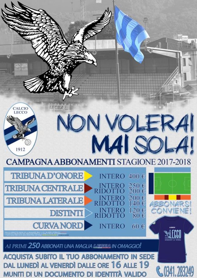Scatta oggi la campagna abbonamenti per la stagione 2017/2018 della Calcio Lecco. Dopo la presentazione in piazza Garibaldi che ha attirato un migliaio di persone, da oggi i tifosi potranno staccare la tessera stagionale per non perdersi nemmeno una partita della formazione bluceleste al “Rigamonti-Ceppi”. Lo slogan scelto dalla nuova società è “Non volerai mai sola”.