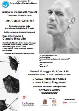 Venerdì 12 maggio alle 17.30: incontro pubblico al Palazzo delle Paure (piazza XX settembre, 22) con Peppe dell’Acqua, direttore del Dipartimento Salute Mentale di Trieste. Lo psichiatra incontra l’autore Alberto Fragomeni per la presentazione del libro “Dettagli inutili”.