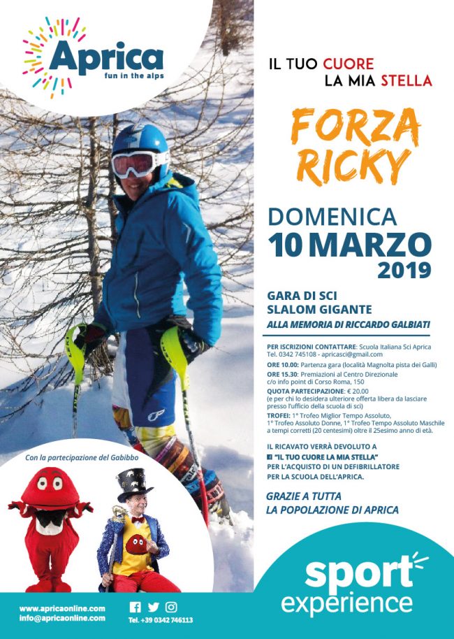 “Con questa iniziativa Riccardo, attraverso a sua famiglia e i suoi amici, continua ad aiutare gli altri come era nel suo stile: lo scorso anno, con il ricavato delle quote di partecipazione, è stato acquistato un defibrillatore per l’Aprica, cosa che faremo anche quest’anno, destinandolo alla Scuola elementare. Sono lieto che la gara di sci possa essere un modo per ringraziare un paese speciale in cui mio figlio Ricky ha passato tanti momenti felici, in inverno sugli sci e d’estate nelle passeggiate”, commenta il padre, Marco Galbiati.