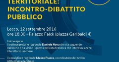 E’ in programma lunedì prossimo, 12 settembre 2016, con inizio alle ore 18.30 presso Palazzo Falck (Lecco, piazza Garibaldi 4) un incontro-dibattito pubblico sul tema delle aree vaste e della riorganizzazione territoriale.Interverranno: – il sottosegretario regionale Daniele Nava che sta