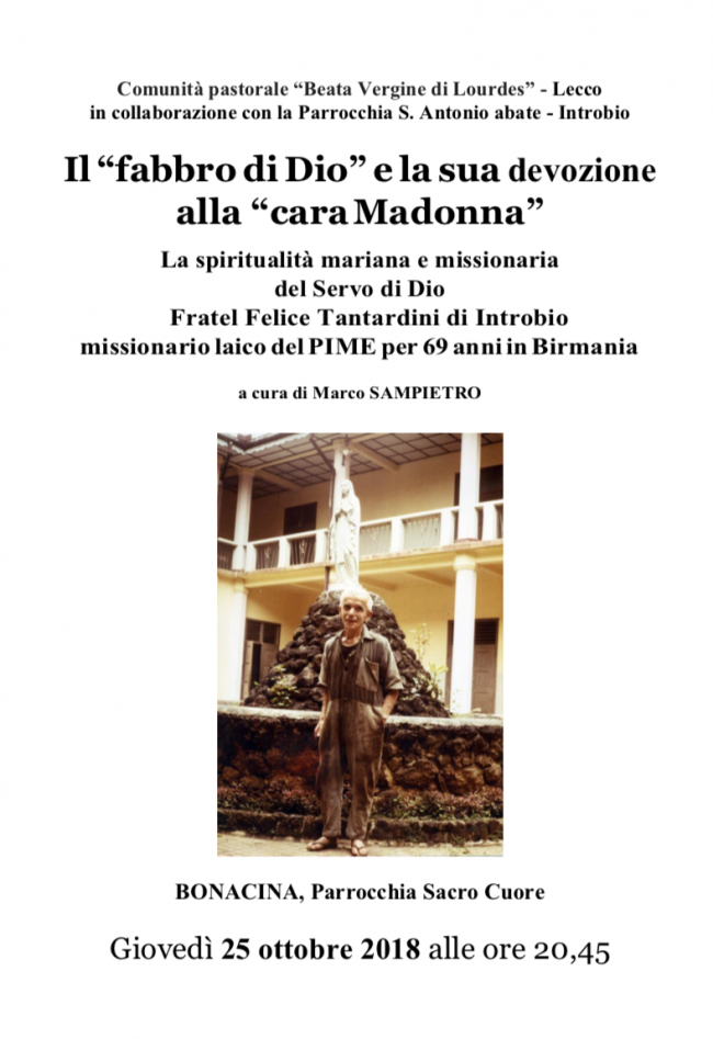 A Bonacina, nella Parrocchia Sacro Cuore, domani giovedì 25 ottobre alle ore 20.45 si terrà un incontro con Fratel Felice Tantardini di Introbio, missionario laico del PIME che ha trascorso 69 anni in Birmania. Parlerà di spiritualità mariana e missionaria.