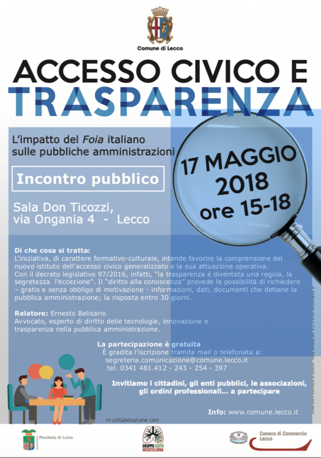 Giovedì 17 maggio dalle 15 alle 18, nella sala Don Ticozzi in via Ongania 4 a Lecco, si terrà il seminario Accesso civico e trasparenza. Quale impatto del Freedom of information Act italiano sulle pubbliche amministrazioni.Relatore Ernesto Belisario, avvocato, esperto di diritto delle tecnologie, innovazione e trasparenza nella pubblica amministrazione.
