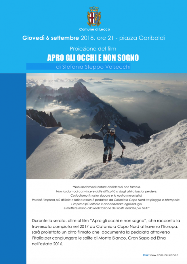 Giovedì 6 settembre alle 21 in piazza Garibaldi, la lecchese Stefania Valsecchi presenta il film “Apro gli occhi e non sogno“: una serata dedicata ai viaggi, allo sport e alle imprese di “Steppo“.
